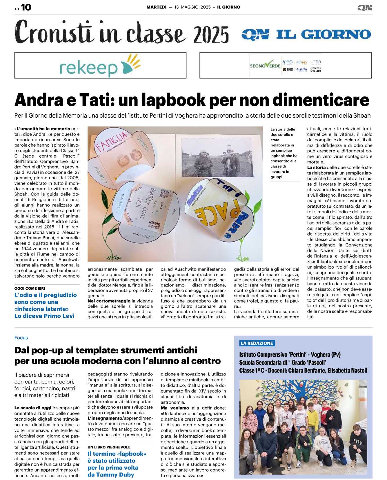 «L’umanità ha la memoria corta», dice Andra, «e per questo è importante ricordare». Sono le parole che hanno ispirato il lavoro degli studenti della Classe 1^ C (sede centrale “Pascoli” dell’Istituto Comprensivo Sandro Pertini di Voghera, in provincia di Pavia) in occasione del 27 gennaio, giorno che, dal 2005, viene celebrato in tutto il mondo per onorare le vittime della Shoah. Con la guida delle docenti di Religione e di Italiano, gli alunni hanno realizzato un percorso di riflessione a partire dalla visione del film di animazione «La stella di Andra e Tati», realizzato nel 2018. Il film racconta la storia vera di Alessandra e Tatiana Bucci, due sorelle ebree di quattro e sei anni, che nel 1944 vennero deportate dalla città di Fiume nel campo di concentramento di Auschwitz insieme alla madre, la nonna, la zia e il cuginetto. Le bambine si salvarono solo perché vennero erroneamente scambiate per gemelle e quindi furono tenute in vita per gli orribili esperimenti del dottor Mengele, fino alla liberazione avvenuta proprio il 27 gennaio.